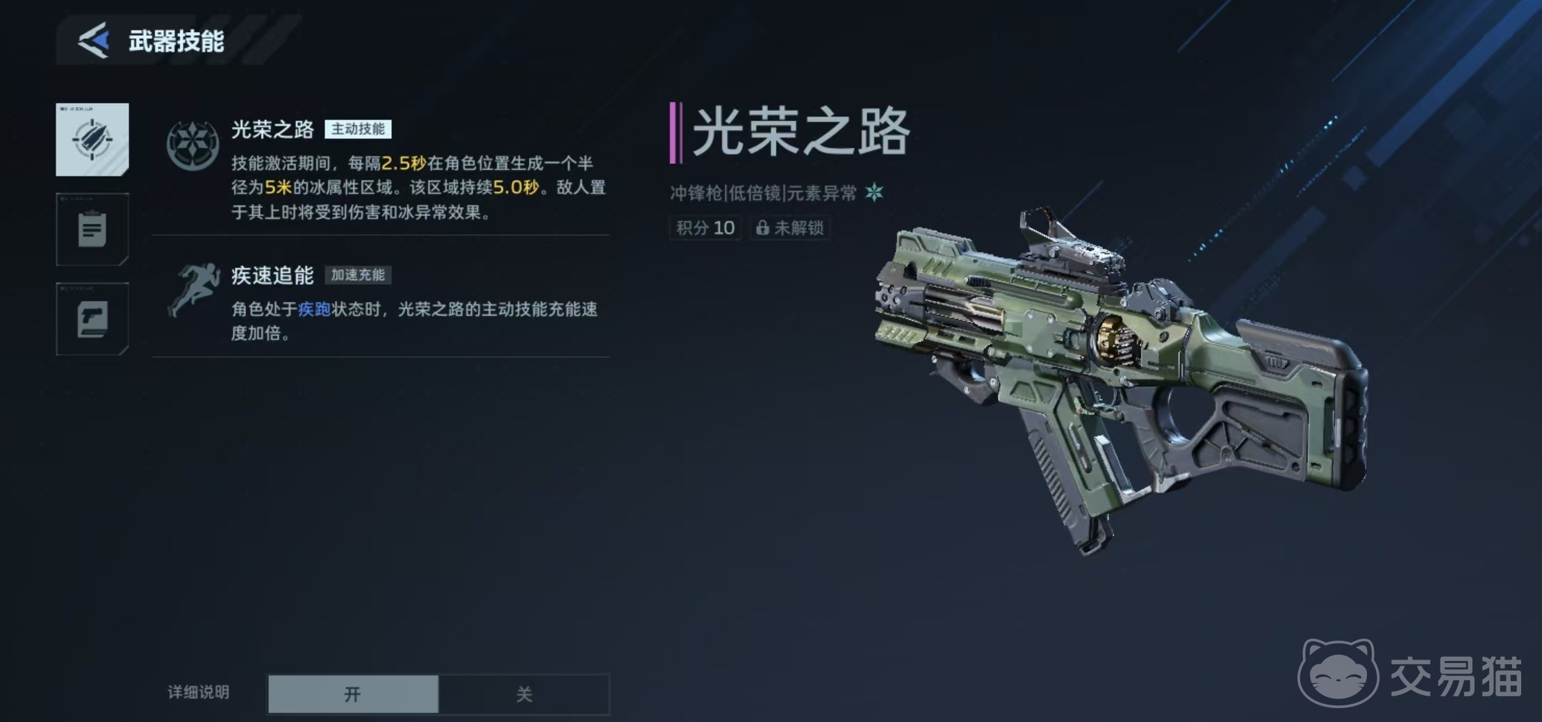 综合性能评估,光荣之路在当前冲锋枪体系中具有独特定位。虽然基础输出数值并非顶尖,但其功能性优势极为突出:主动技能激活后,每2.5秒在角色当前位置生成一个寒冷属性区域,对范围内敌人造成持续伤害并附加寒冷异常状态;被动技能设定为——角色处于疾跑状态时,主动技能充能速度提升至2倍。这意味着持续移动即可维持高频区域布设节奏,从而在面对成群小怪或精英单位时,构建出高效的风筝作战体系。