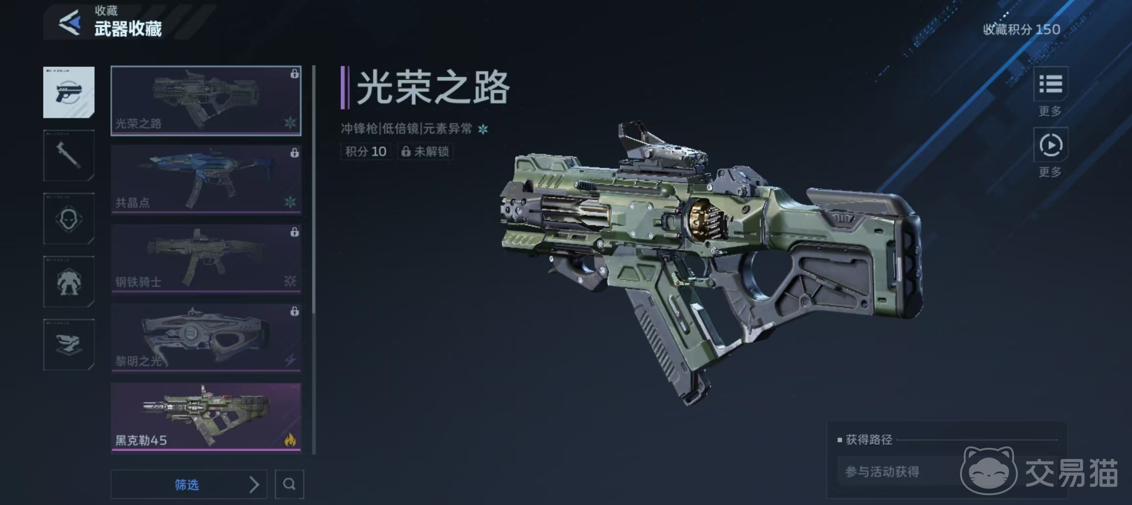 当前版本实装的冲锋枪主要包括光荣之路、共晶点、钢铁骑士、黎明之光、黑克勒45五款基础型号,并配套推出多款皮肤变体,例如黑克勒45金炼、共晶点野草、黑克勒45星蓝破晓等。尽管各武器外观与特效不同,其获取逻辑既有共通性,也存在差异化设计。