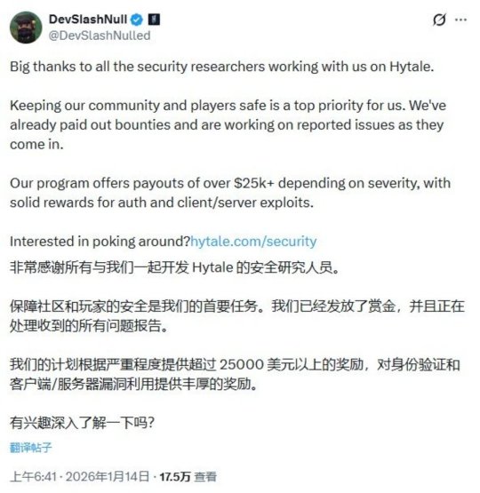 然而,与多数早期访问游戏一样,《Hytale》的首发周并非一帆风顺,游戏存在一些预期内的错误与技术问题。为确保游戏安全稳定,开发商Hytale团队近日正式推出了一项漏洞赏金计划,为发现并报告安全漏洞的玩家提供总额超过2.5万美元的奖励。
