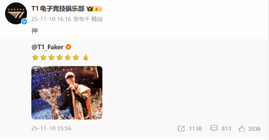 T1战队官方账号也转发了这条推文,仅用一个字表达了对Faker这位传奇选手的看法:“神”。