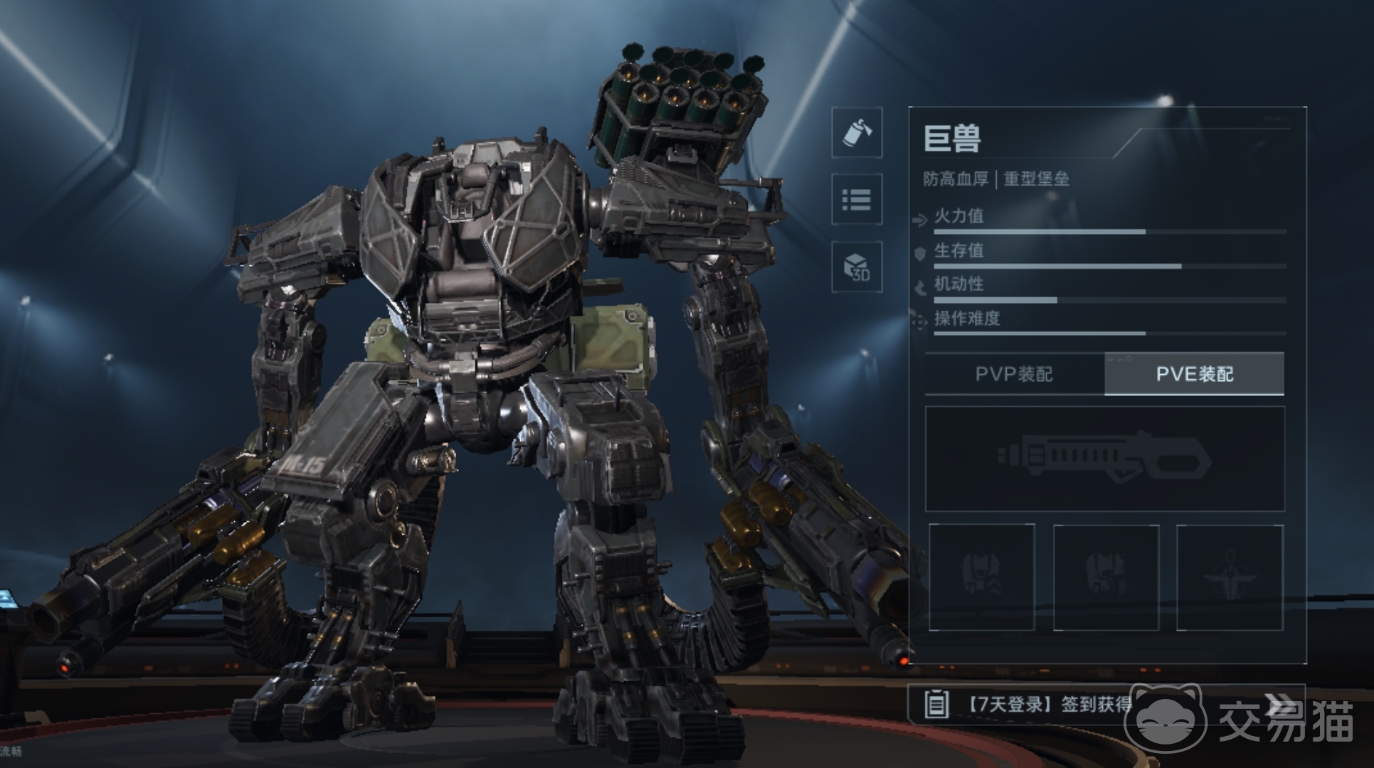 巨兽机甲需完成累计7日签到方可激活,解锁后即获得基础配件库。在PVE副本实战中,主炮推荐选用【双联装重装加农炮】——该配置可同步提升单发伤害、弹匣容量与射速三项关键参数,适用于中远距离持续压制。