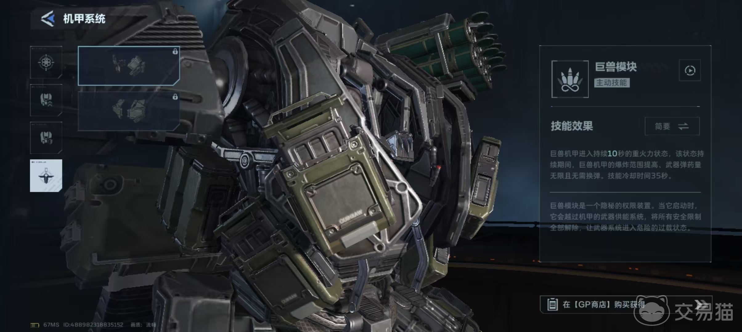 前胸核心模块提供两种战术方向:【巨兽模块】激活后进入重火力状态,期间持续输出范围伤害且无需换弹,冷却时间35秒;【无敌屏障】则赋予使用者4秒完全免疫伤害的防护窗口,冷却时间为25秒,适用于高危机制应对场景。