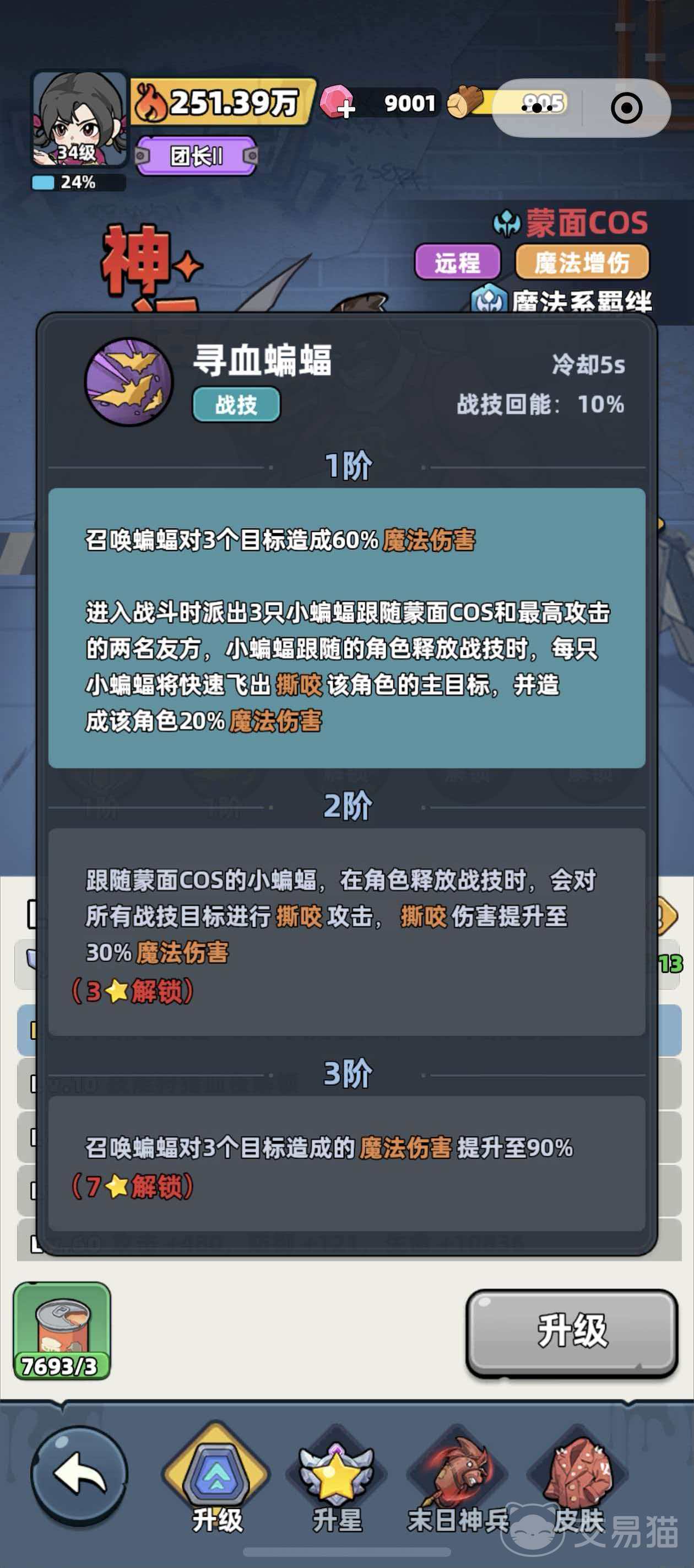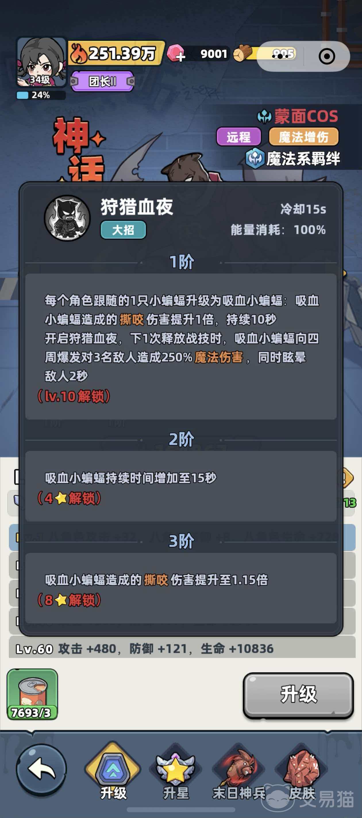 职业特性方面,蒙面cos拥有【远程】标签,全伤害提升25%;同时具备【幸存者】特质,使其自身释放的魔法伤害额外提高10%。技能体系由三部分构成:战技【寻血蝙蝠】、终极技能【狩猎血夜】及被动【夜影幽冥】。