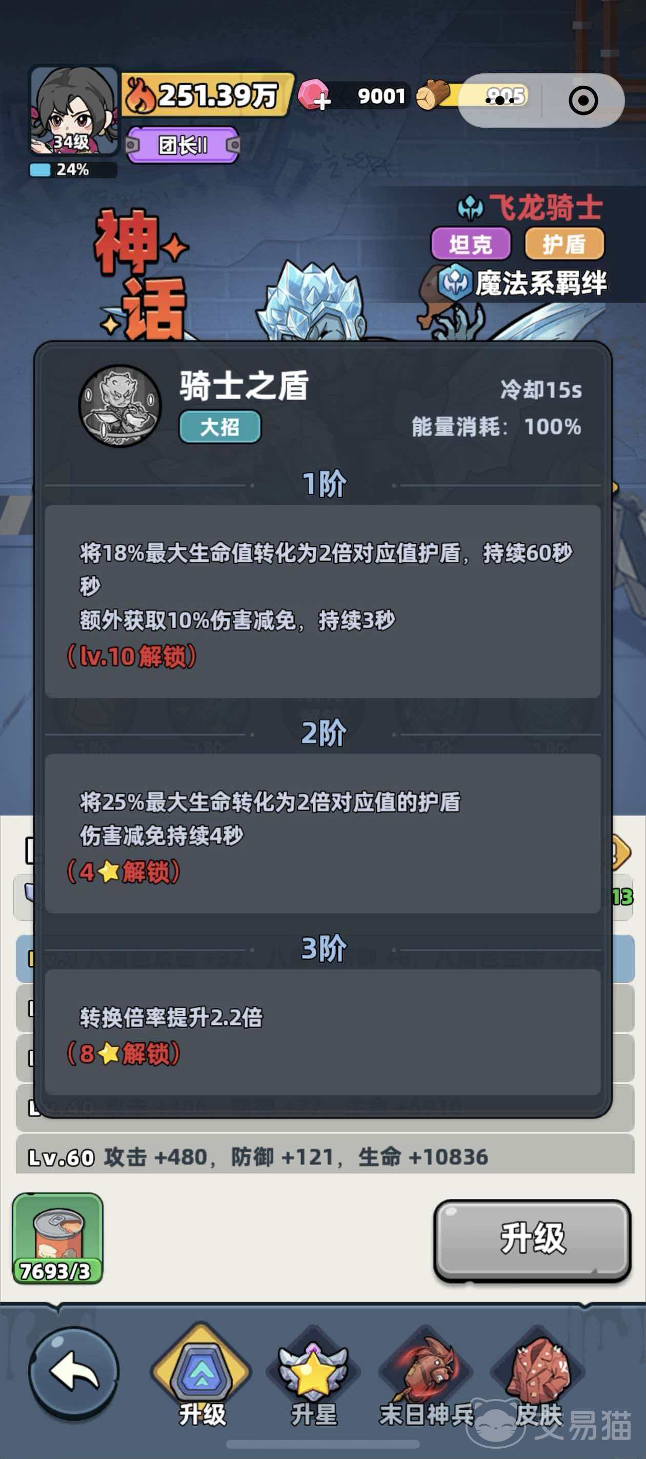 该英雄共配备4项技能:2个主动技与2个被动技。其中极夜侵蚀、凛冬庇护、护盾强化三项在获取角色时自动激活;而大招“骑士之盾”需将飞龙骑士等级提升至10级方可解锁。