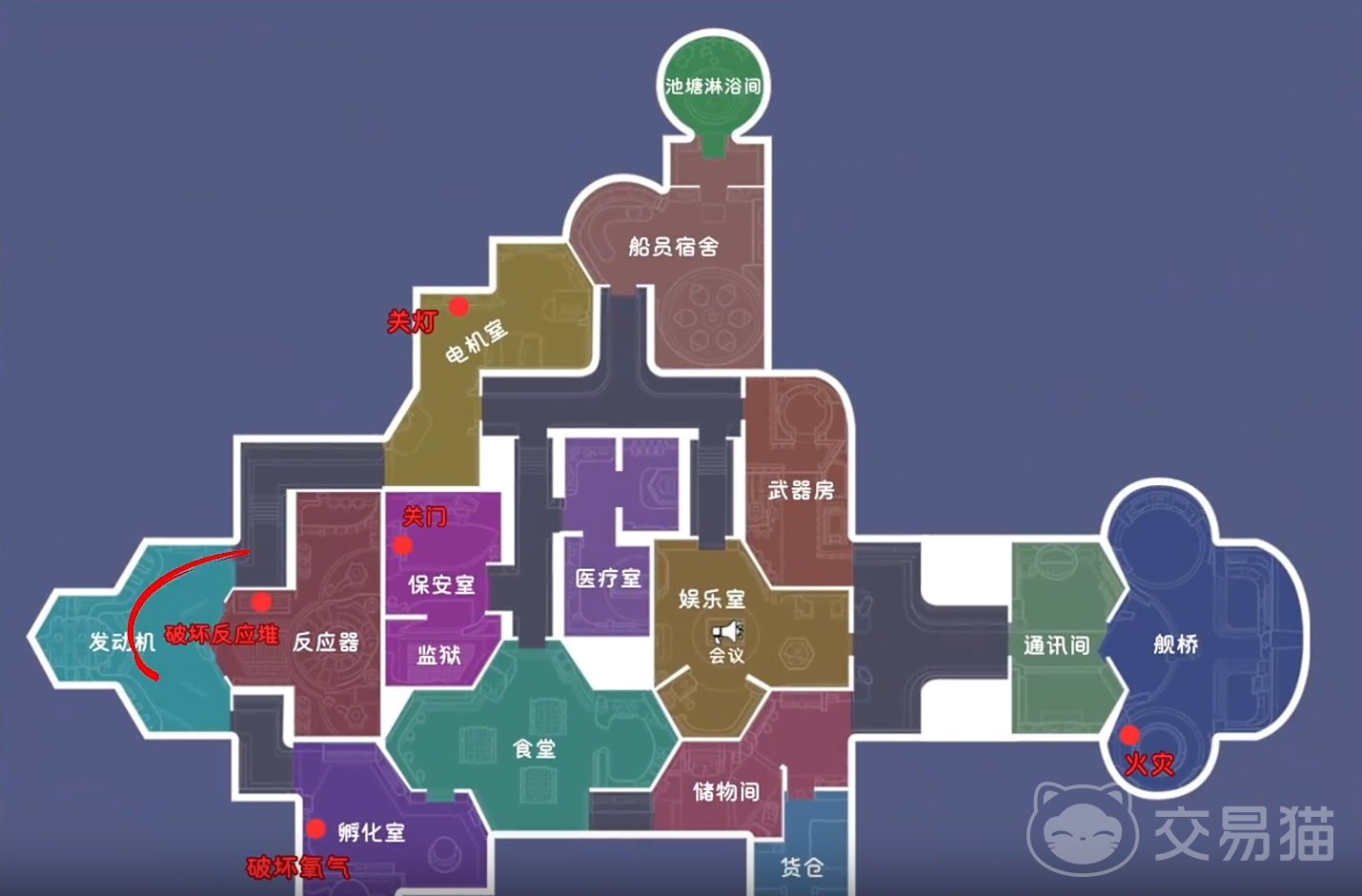 “火灾”事件一旦激活,同样进入不可逆倒计时,若未能及时扑灭,鸭子获胜;该状态下亦无法发起会议,仅支持尸体报告。“关门”事件会同步锁闭全船所有舱门,将玩家隔离于独立空间内,但通风口仍保持开放状态,可供特定角色通行。