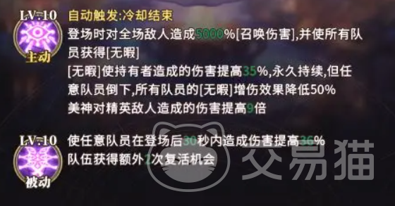 美神的主动技能在登场瞬间触发,对全体敌方单位造成5000%召唤伤害,并为我方全体角色赋予「无暇」状态。「无暇」可使持有者造成的输出提升35%,且效果永久持续,不随时间衰减。该增益直接作用于所有已上场及后续登场的友方单位,显著拉升整支队伍的DPS基准线。