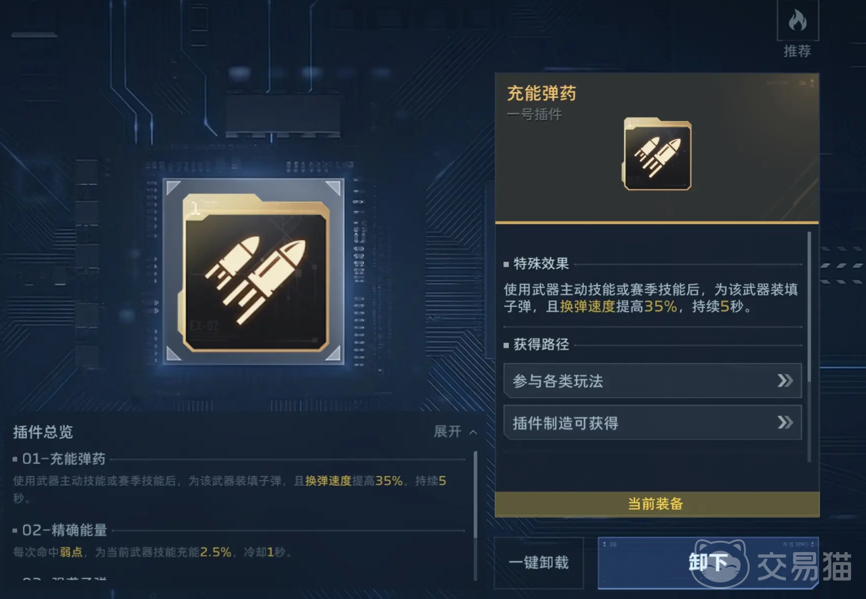 首推插件为【充能弹药】——该金色插件具备全武器系高兼容性,核心作用是大幅压缩换弹动作耗时,有效缩短火力输出间隙。在快节奏交火或连续推进关卡中,这一特性可显著降低因换弹导致的生存风险。获取途径包括主线剧情进度解锁、日常挑战任务奖励及周期性限时活动。