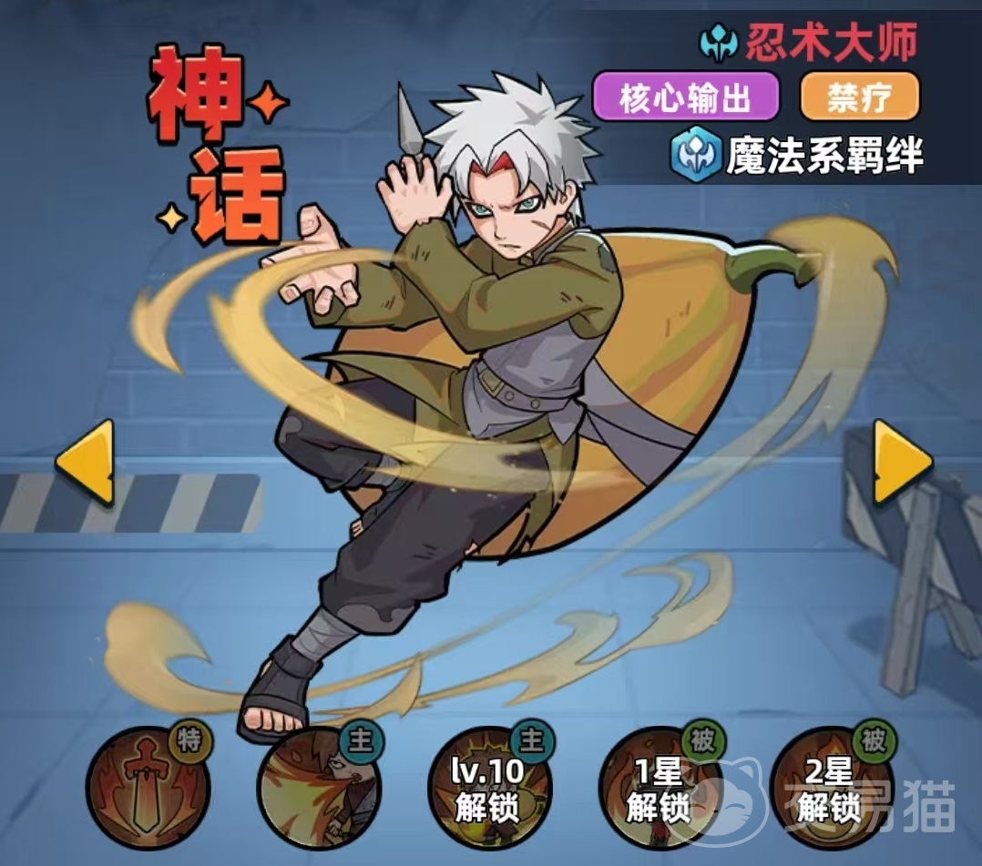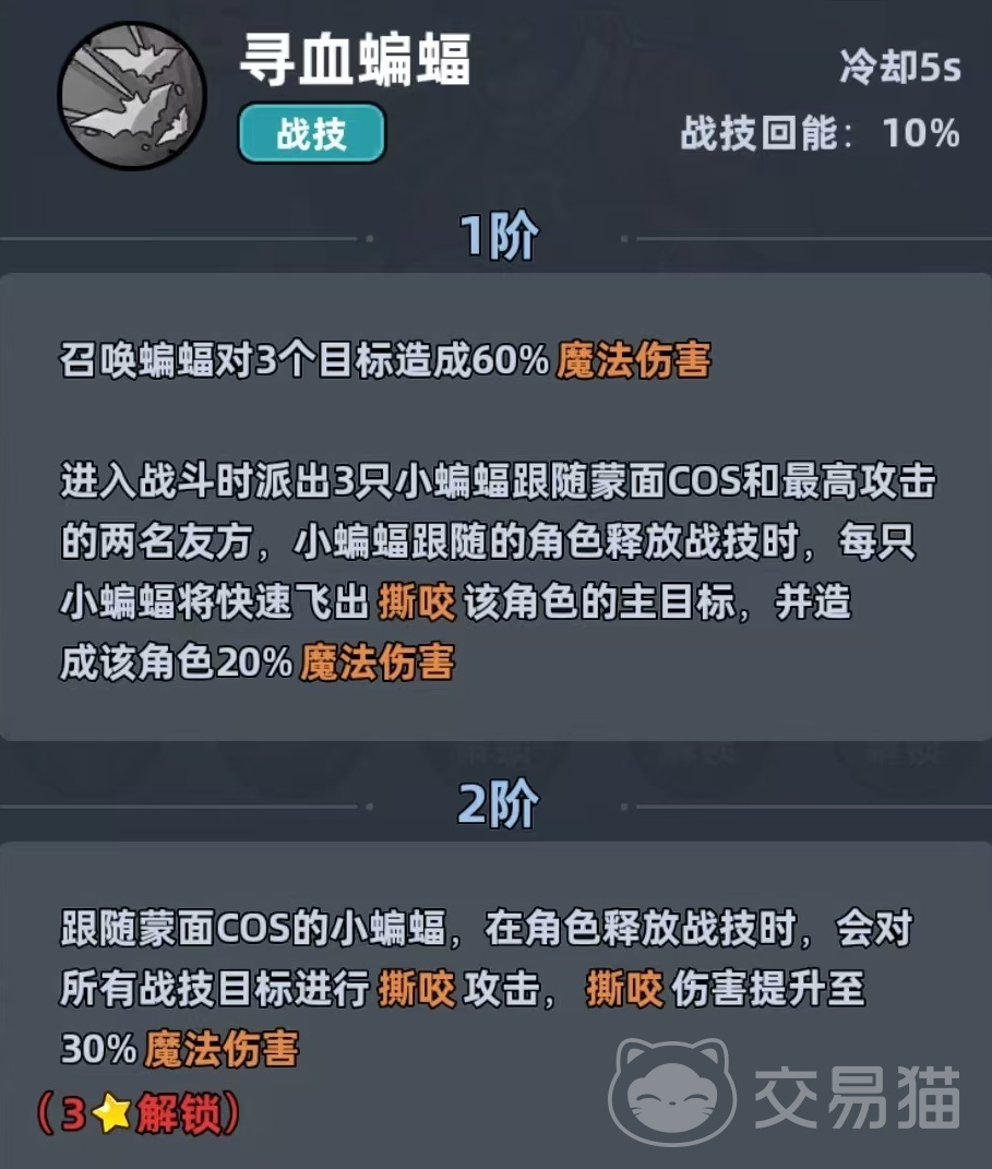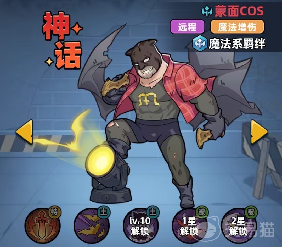 蒙面COS为神话品质远程法师,绑定魔法系羁绊。基础能力提供全伤害25%加成与额外10%魔法伤害提升。其主动技能“寻血蝙蝠”可对至多三名敌人施放魔法伤害;进入战斗时,自动部署三只小蝙蝠——分别跟随自身及场上攻击力最高的两名友方单位;当目标角色释放战技时,对应蝙蝠同步发动撕咬,造成附加魔法伤害,实现技能联动增益。