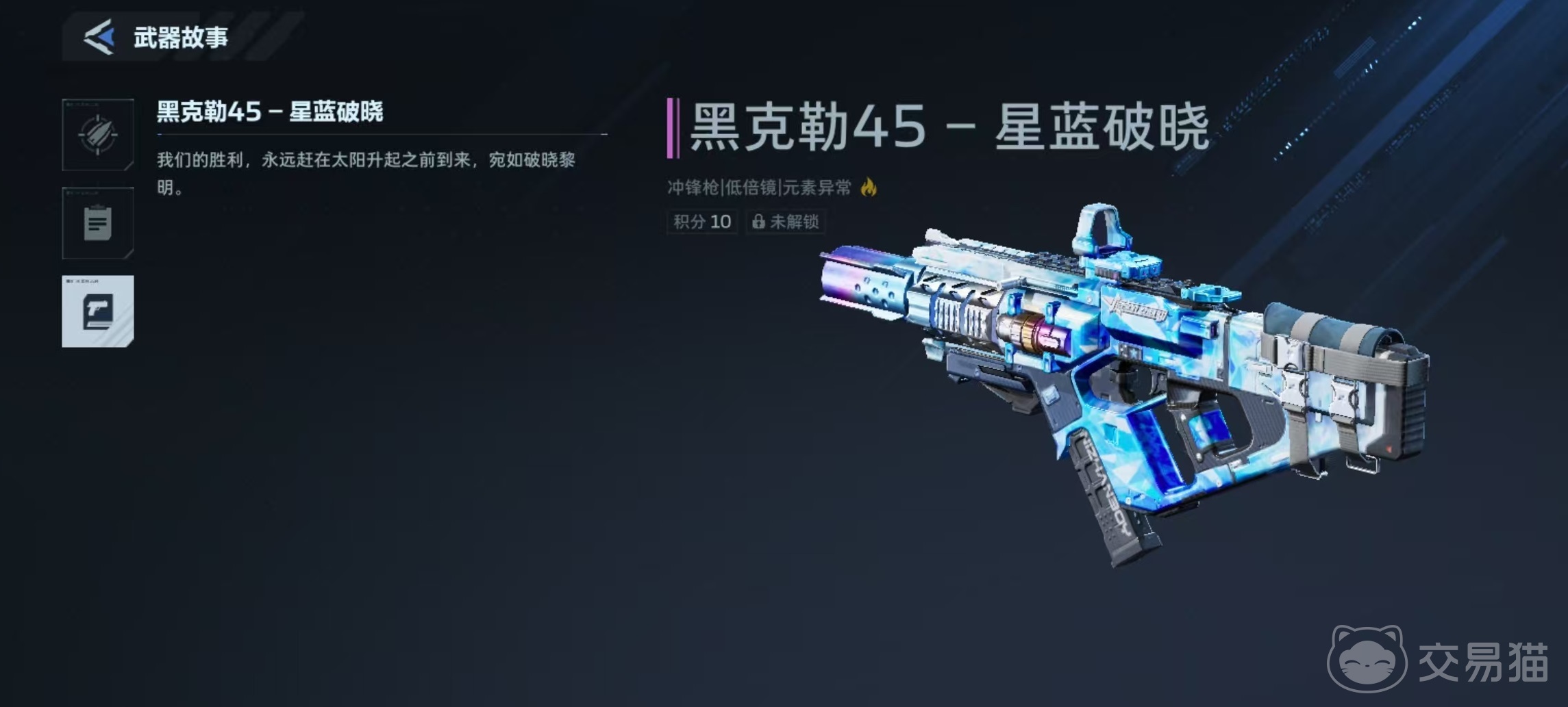 黑克勒45是《逆战:未来》中玩家初入游戏时默认配备的经典冲锋枪,凭借易上手的操作逻辑与稳定的输出表现,长期占据新手过渡阶段的主力位置。在基础型号基础上,官方陆续推出了多款主题皮肤,其中“星蓝破晓”作为高人气定制版本,以冷峻科技感的蓝色光效涂装与流线型结构设计脱颖而出,兼具视觉辨识度与收藏价值。