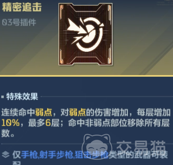 除武器选择外,配件搭配同样关键。该流派首选核心配件为“精密追击”,其效果为:每次命中敌人弱点,自身伤害提升10%,最多叠加6层;若任意一次攻击未命中弱点,则层数清零。该机制强调操作一致性与目标聚焦能力。