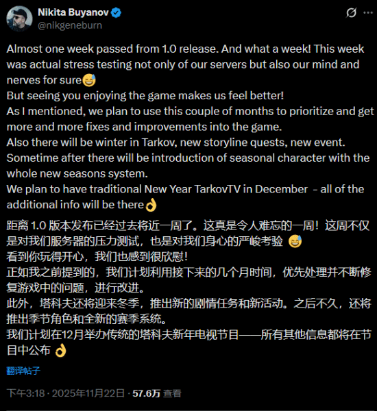 他随后谈到了游戏在年末的一些计划:“我们计划利用接下来这几个月,把更多的修复和改进优先加入游戏。此外,塔科夫将迎来冬季、新的故事任务、新的活动。之后某个时间点,还会加入拥有全新赛季系统的季节性角色。”另外,《逃离塔科夫》传统的的“塔科夫TV”也将照例在12月举行并提供其他信息。