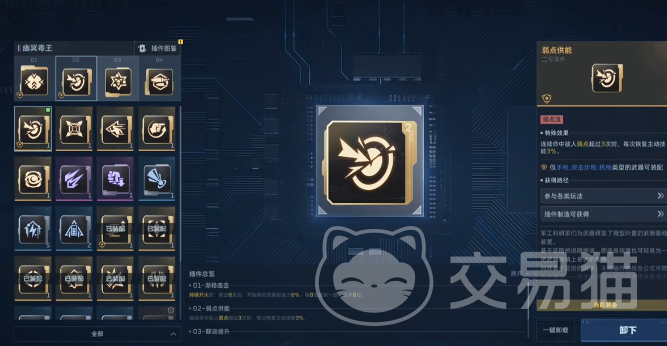 插件组合直接决定幽冥毒王的战场定位。猎场与塔防两种模式需差异化配置:猎场推荐1号插件选择“剑吻连击”,虽不提供直接伤害加成,但可增强控枪精度,并在主动技能释放后额外提升换弹速率,确保输出连贯性;2号插件建议搭配“超频蓄能”,使技能充能速度提升50%,大幅缩短技能冷却间隔;若侧重弱点打击循环,则可启用“弱点反馈”类插件——每命中敌人弱点3次,即恢复3%主动技能能量。副武器过渡期推荐使用“超级复合弓”,其技能激活后可提供30%射速加成,强化衔接效率。