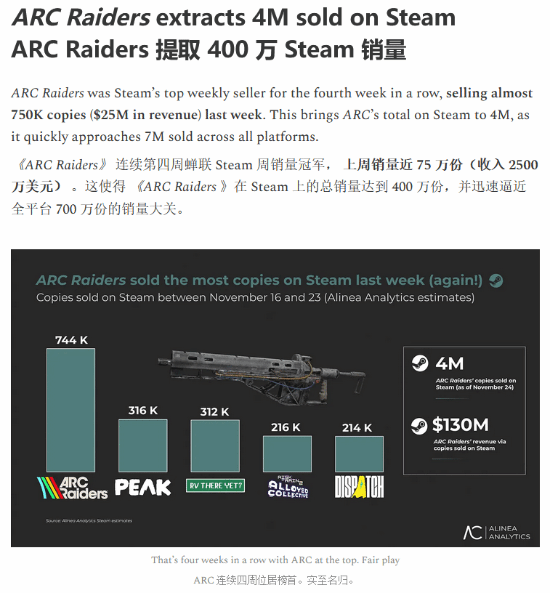 根据Alinea Analytics的报告,《Arc Raiders》已经连续第四周成为Steam的周销冠军,上周又卖出了近75万份(营收达2500万美元)。这使其在Steam上的总销量达到400万份,同时其全平台销量也正迅速逼近700万。