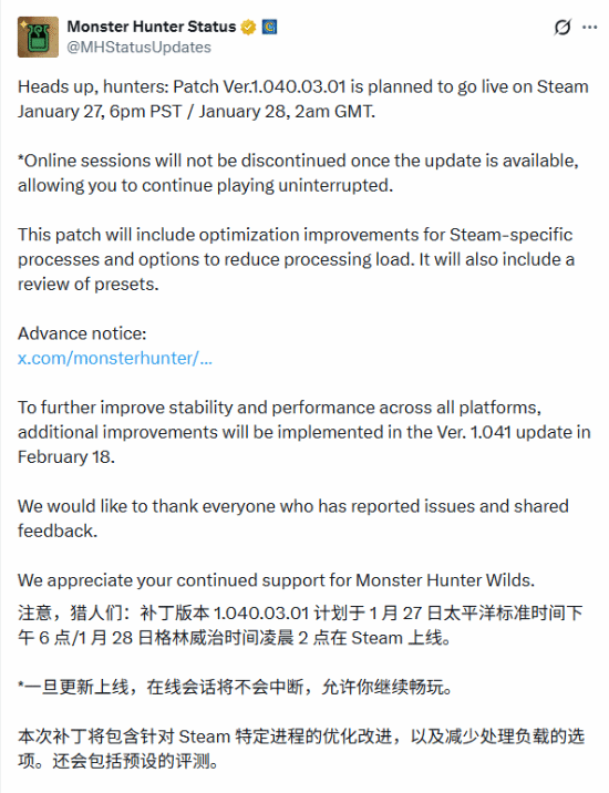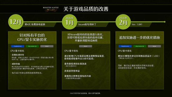上个月,卡普空发布了三次旨在提升《怪物猎人:荒野》性能更新中的第一个。而第二个专为 PC 版本设计的更新现已确定正式发布日期:将于1月28日北京时间上午10点上线。