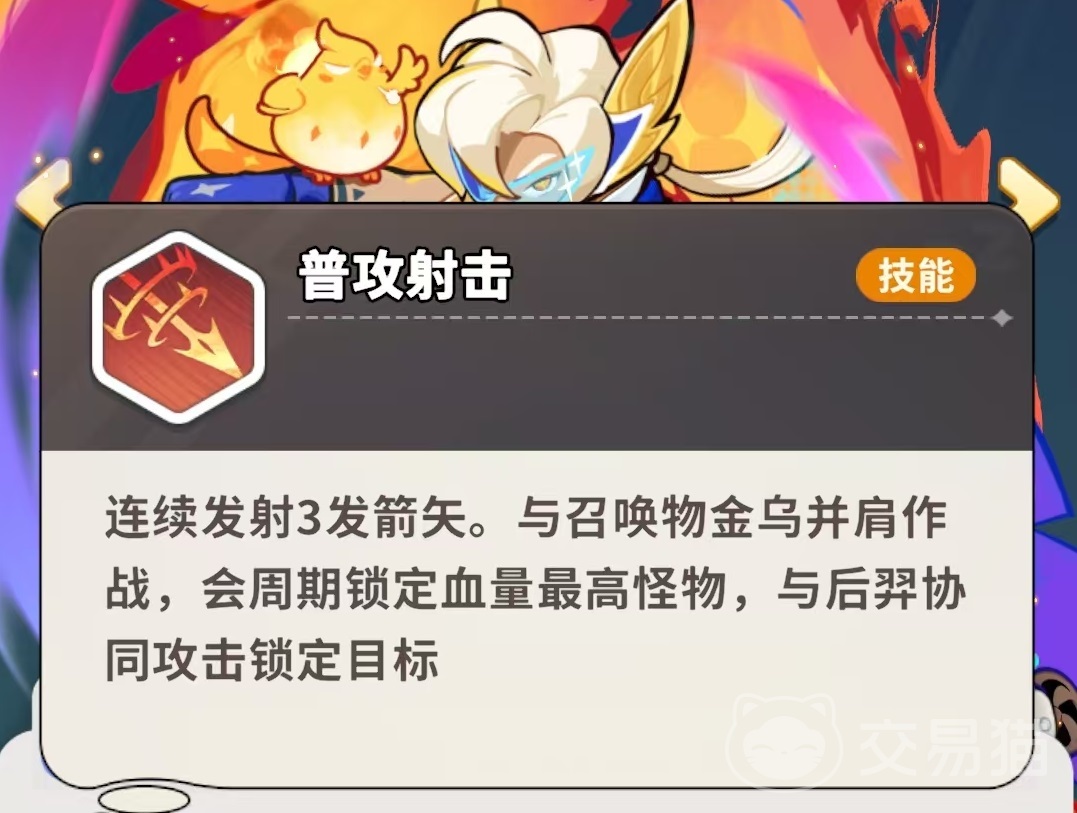 后羿的基础技能为三连矢射击,配合召唤物金乌协同作战。金乌具备智能索敌能力,会周期性锁定当前生命值最高的敌方单位,并与后羿同步发起集火攻击,显著提升对高威胁目标的击杀效率。