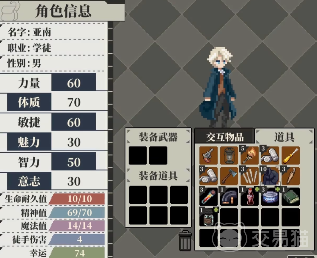 界面中部为装备管理区,涵盖主武器、副手装备及已激活道具。右侧为道具库入口,点击后可查看道具详情,包括名称、效果说明与使用限制。例如风衣类道具可提升道具使用频率,但属一次性消耗品,需及时补充库存以维持连续作战能力;饮料类提供临时增益,喷火器则具备环境交互功能,可用于清除障碍物或压制特定敌人类型。
