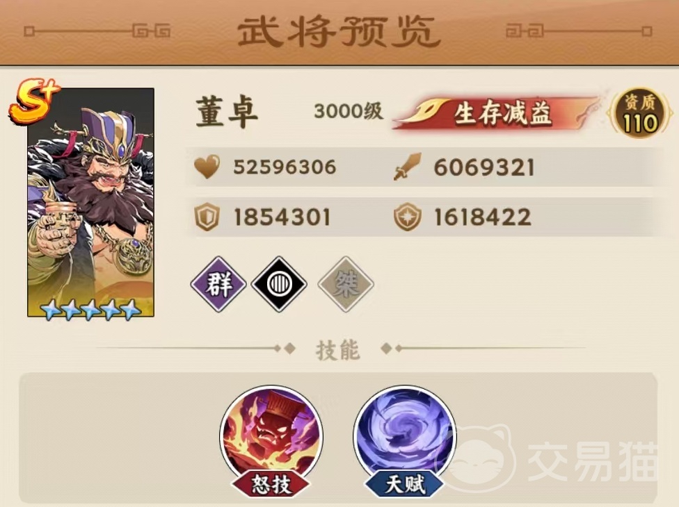 董卓资质高达110,为全游戏顶尖水平。其怒气技能具备高额物理伤害,并在释放后触发自身生命值回复,兼具输出与续航能力,使其成为前排稳定承伤的核心人选。作为虎卫职业,他天然享有额外生命加成及物理近战伤害增益。星级成长路径明确:五星时,敌方单位被击败可恢复自身生命;九星时,提升同排友军减伤属性;晋升至英杰一星后,开局免疫一次控制效果,且该状态下所受暴击伤害降低;英杰三星进一步削弱敌方减伤;无双阶则在承受主动攻击时,同步降低敌方减伤、暴击抗性及异常伤害减免能力。