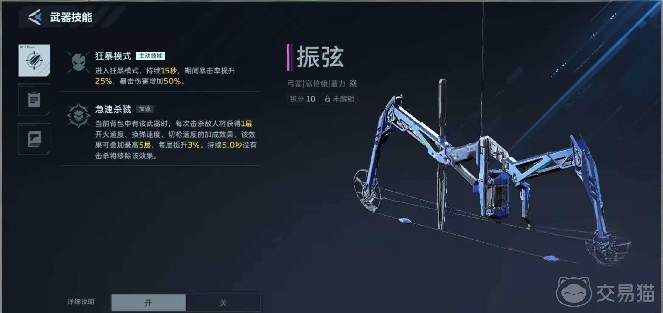 振弦则侧重持续作战与节奏增益。其单发伤害与射速略低于超级复合弓,但技能逻辑更强调“滚雪球式”成长。主动技能“狂暴模式”激活后,射速提升25%,暴击伤害提高50%,且每次命中均可叠加15%的总伤害加成;被动技能“急速杀戮”无需装备即可生效——只要振弦存在于背包中,玩家每完成一次击杀,即永久获得一层增益,涵盖开火速度、换弹速度与切枪速度三项关键操作参数,适合高频交火的近中距离对抗。