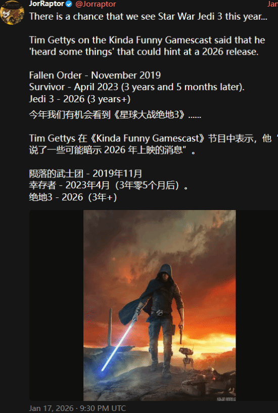 星战系列的粉丝们注意了!期待已久的《星球大战绝地3》,或许将在2026年和大家正式见面。