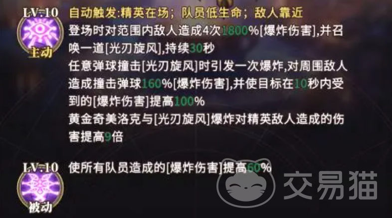 黄金奇美洛克的主动技能为条件触发式:当战场存在精英敌人、我方单位生命值低于安全阈值,或敌方单位逼近关键区域时,技能将自动激活。登场瞬间,她将对范围内所有敌人造成总计1800%攻击力的四段连锁爆炸伤害;同时生成持续30秒的光刃旋风。所有弹球类单位在撞击该旋风时,均会引发一次额外爆炸,造成相当于弹球本体160%攻击力的范围伤害。被旋风命中目标将在10秒内承受额外100%的爆炸伤害增幅,对精英单位则提升至9倍伤害系数。
