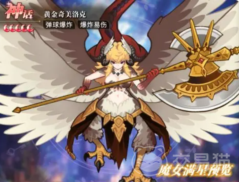 从美术表现来看,黄金奇美洛克融合了半神化特征:背生羽翼、下肢呈鹰爪形态、上半身保持人形轮廓,手持巨型法杖,整体形象兼具神圣感与野性张力。在角色定位上,她属于典型的范围型爆炸伤害担当,技能机制围绕“弹球 爆炸 易伤”三重效果构建。其基础攻击可对目标施加易伤状态,显著提升我方全体对受击单位的爆炸类伤害效率。