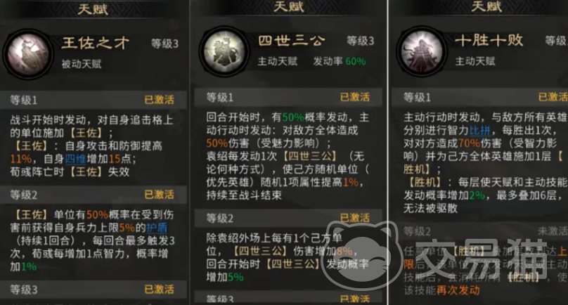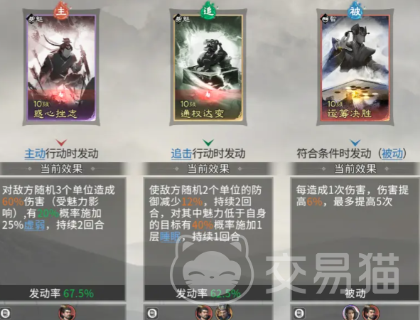 天赋系统是本阵容的核心驱动力。袁绍“四世三公”天赋拥有60%发动率,可在回合开始时施放全体伤害,并为友方随机单位叠加属性增益,全程累计增益效果显著。荀彧“王佐之才”提供11%攻击与防御提升,并额外增加15点四维属性,同时赋予受加持单位触发兵力护盾的概率;每1点智力还将进一步提升护盾生效几率。郭嘉“十胜十败”则侧重智力博弈,智力比拼获胜后可造成群体伤害并叠加“胜机”状态,实现战术补强。