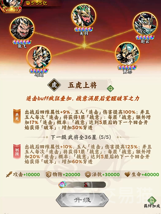 五虎上将阵容由马超、赵云、黄忠、张飞、关羽五名武将组成。集齐后自动激活两项专属羁绊:其一为“追击倍率提升”,其二为“战意增益”。这两大效果并非孤立生效,而是形成攻防一体的循环增强链路,构成该阵容不可替代的战略价值基础。