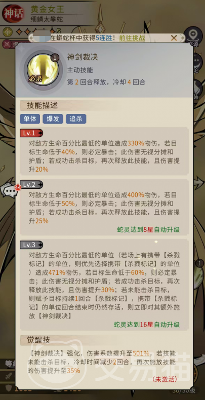 该技能随星级成长显著:8星时基础伤害升至400%,暴击触发阈值放宽至目标生命低于50%,追击伤害增幅提升至25%;16星阶段,若场上存在携带【杀戮标记】的敌人,黄金女王将强制锁定该目标,造成471%物理伤害;此时暴击触发条件为生命低于60%,成功击杀后追加伤害提升至30%;若追击未达成击杀,则为目标施加持续1回合的【杀戮标记】;此外,若回合结束时仍有携带【杀戮标记】的敌人存活,黄金女王将立即对其额外发动一次【神剑】效果。