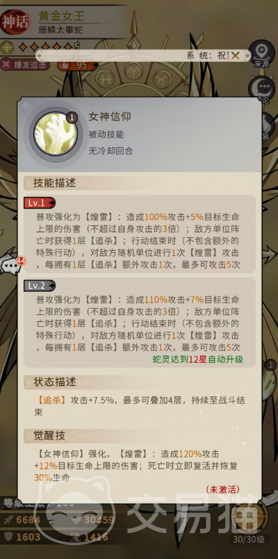 另一被动【女神信仰】则重构普攻逻辑:普攻升级为【煌雷】,造成100%攻击力 5%目标最大生命值的伤害(总伤害不超过自身攻击力3倍);每当敌方单位阵亡,黄金女王获得1层【追杀】;行动结束时,依据【追杀】层数对随机敌方单位发起额外【煌雷】攻击,每层【追杀】对应1次额外攻击,最多叠加至5次;12星后,【煌雷】伤害提升至110%攻击力 7%目标最大生命值,且击杀目标后仍可获得1层【追杀】,延续多段追击能力。