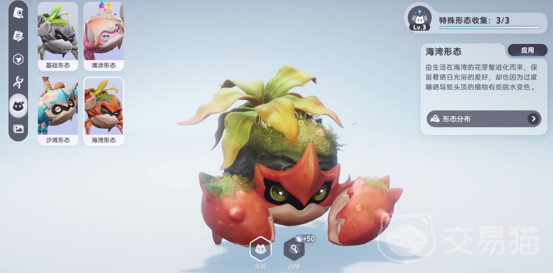 除基础形态外,花芽蟹还存在三种明确的地域特化形态:滩涂形态分布于湘花岸区域;沙滩形态活跃于鲸落浅滩周边;海湾形态则稳定出现在欧鸣湾水域。三者在甲壳纹理、节肢色泽及附肢结构上均存在可观测的差异化特征,印证了游戏内“生境塑造形态”的底层设计逻辑。