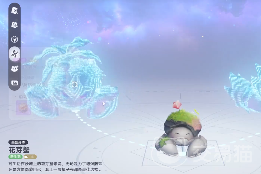 花芽蟹的最终进化形态为晶壳蟹,该形态仅在云上草原经脉树附近生成,且需玩家成功击败晶壳蟹头目级BOSS后方可解锁。其通体结晶化的甲壳结构与能量脉络纹路,标志着该伊莫已进入生态链顶端的成熟阶段。此外,游戏内还存在闪光形态、中毒形态等特殊状态变体,更多形态将在二测版本中逐步开放。