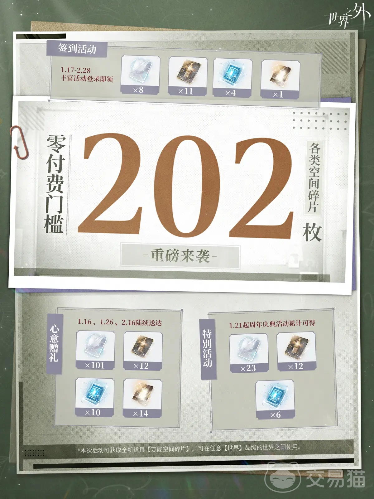 《世界之外》迎来二周年庆典,官方于1月16日举办前瞻直播,为玩家集中揭晓本次周年版本的核心内容。考虑到部分玩家朋友可能未能及时观看,本文将系统梳理庆典期间的更新要点与福利安排,帮助大家高效掌握关键信息。