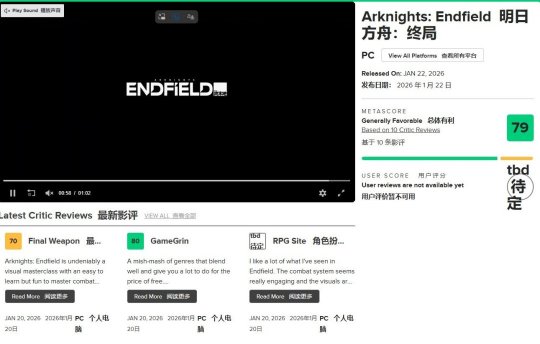 由鹰角网络开发的3D即时策略RPG《明日方舟:终末地》首批媒体评测现已解禁。游戏在Metacritic平台获得了综合评价79分的佳绩,多家媒体肯定了其在玩法融合与视觉表现上的野心。