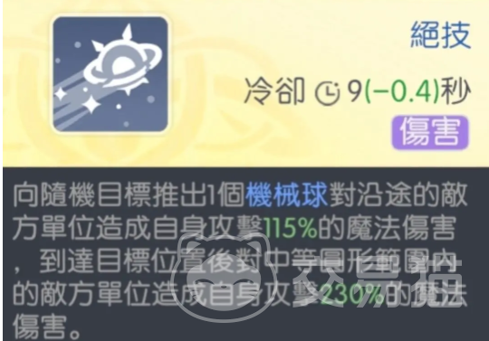 塔罗丝的核心战斗逻辑围绕“机械球”展开。其天赋可在战斗初始阶段,自动在敌方攻击力最高的单位周围部署机械球;每次释放技能均可额外追加一枚,场上最多同时存在6枚,每枚持续20秒。当角色生命值下降并积满怒气后,将立即触发“狂野状态”——所有在场机械球每0.5秒对附近敌人造成相当于90%法术强度的范围伤害。作为高阶法师,她还拥有强力奥义“毁灭指令”,可对大范围目标施加高达510%法术强度的爆发伤害。