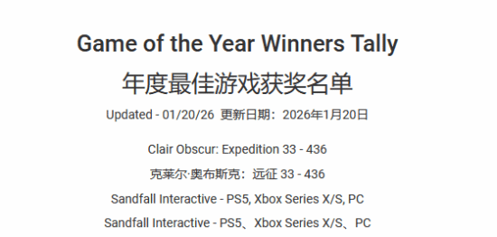 据游戏论坛ResetEra的统计,《光与影:33号远征队》凭借着436家媒体颁发的“年度最佳游戏”成为历史第一名,超越了由《艾尔登法环》此前保持的429个“年度最佳游戏”的纪录。