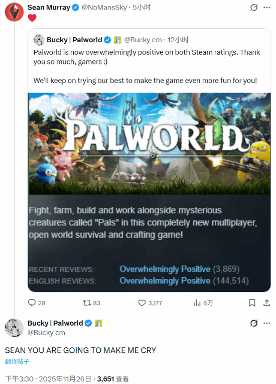 这一动态引起了《无人深空》制作人肖恩·默里的注意。他转发了该消息并附上爱心符号以示祝贺。巴克利感动回应:“肖恩,你要把我弄哭了。”