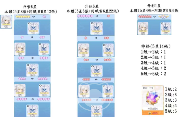 角色升星共分三个关键层级:紫色6星阶段需消耗5星本体8个 同职业6星角色12个,属基础战力跃升节点,素材获取难度较低,建议优先完成主力输出或核心辅助角色的该阶段突破;红色6星阶段需5星本体6张 同职业6星角色22张,突破后技能效果与基础属性将实现质性增强,构成中期队伍强度的中坚支撑;彩色星级为终极质变节点,需5星本体4张 同职业6星角色6个 五星神格14章,且神格自身亦需逐级升阶,不可跳过任一等级。