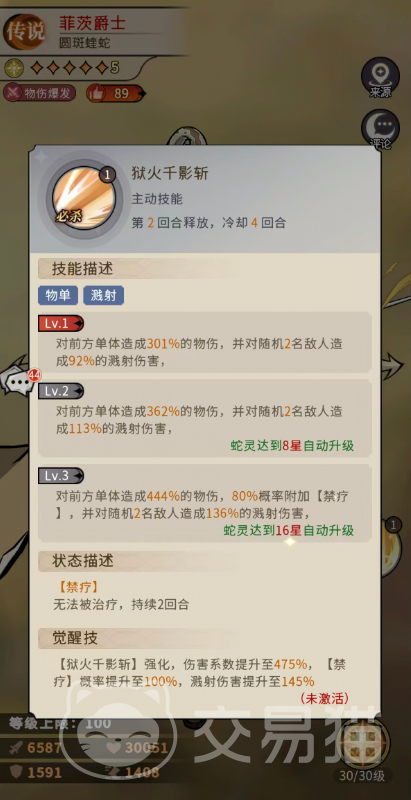另一主力技能【狱火千影斩】则兼顾单体穿透与群体干扰能力:初始版本对前方单体造成301%物理伤害,并随机溅射2名敌人各92%伤害;升至8星后,单体伤害提升至362%,溅射伤害提升至113%;达到16星时,单体伤害跃升至444%,同时80%概率附加【禁疗】效果,并使溅射伤害提升至136%。【禁疗】效果可有效压制敌方治疗链,在对抗以奶妈为核心的续航体系时具有决定性优势。使用时建议优先锁定血量最低目标,且务必确保菲茨爵士行动顺序靠前,尤其在针对敌方核心输出单位时,先手释放可显著扩大战果。
