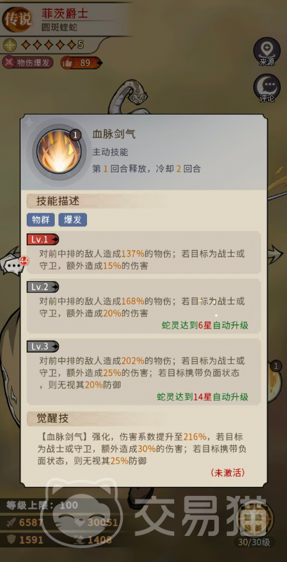 核心群攻技【血脉剑气】具备明确的职业打击倾向:对前中排目标造成137%物理伤害,若目标为战士或守卫类角色,则额外提升15%伤害;升至二级后,基础伤害提升至168%,额外增伤同步增至20%;满级三级时,基础伤害达202%,额外增伤达25%。更关键的是,当被选中目标已处于负面状态时,该技能可无视其20%防御。这一机制使其在前中期对抗以坦克为核心站位的阵容时尤为高效——既能快速压低前排生存阈值,又能通过精准选人实现伤害最大化分配。