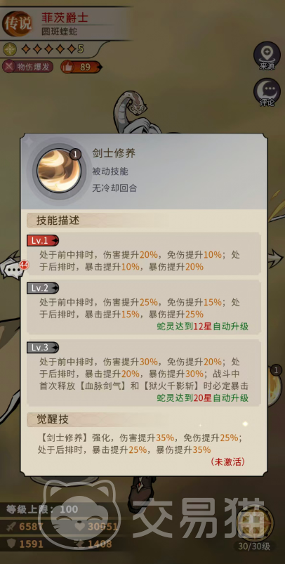 被动天赋【蝰蛇体质】提供阶梯式属性强化:基础形态增加25%攻击与15%生命;10星解锁后提升至35%攻击与20%生命;18星完全激活时可达45%攻击与25%生命加成。该被动不仅直接放大所有技能的基础伤害,还根据菲茨爵士当前生命百分比动态调节作战效能——在不同血量区间分别提供最高20%伤害增幅与10%减伤效果;当处于后排位置时,额外获得10%暴击率与20%暴击伤害提升。星级差异直接影响其战场适应性与容错空间。