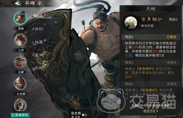 周泰的基础成长属性虽不突出于爆发伤害,但其技能机制围绕“分担”与“代偿”展开:他可主动承接队友所受的部分伤害,且分担比例可观;当敌方目标兵力高于当前兵力百分比阈值时,有概率全额承担该次攻击伤害,每回合最多触发三次。这一机制使其成为脆皮核心输出(如陆逊、太史慈)的理想护盾——尤其在敌方拥有高频单点爆发或控制技能时,“舍身相护”天赋能有效延缓我方关键单位退场节奏,提升整体续航能力。