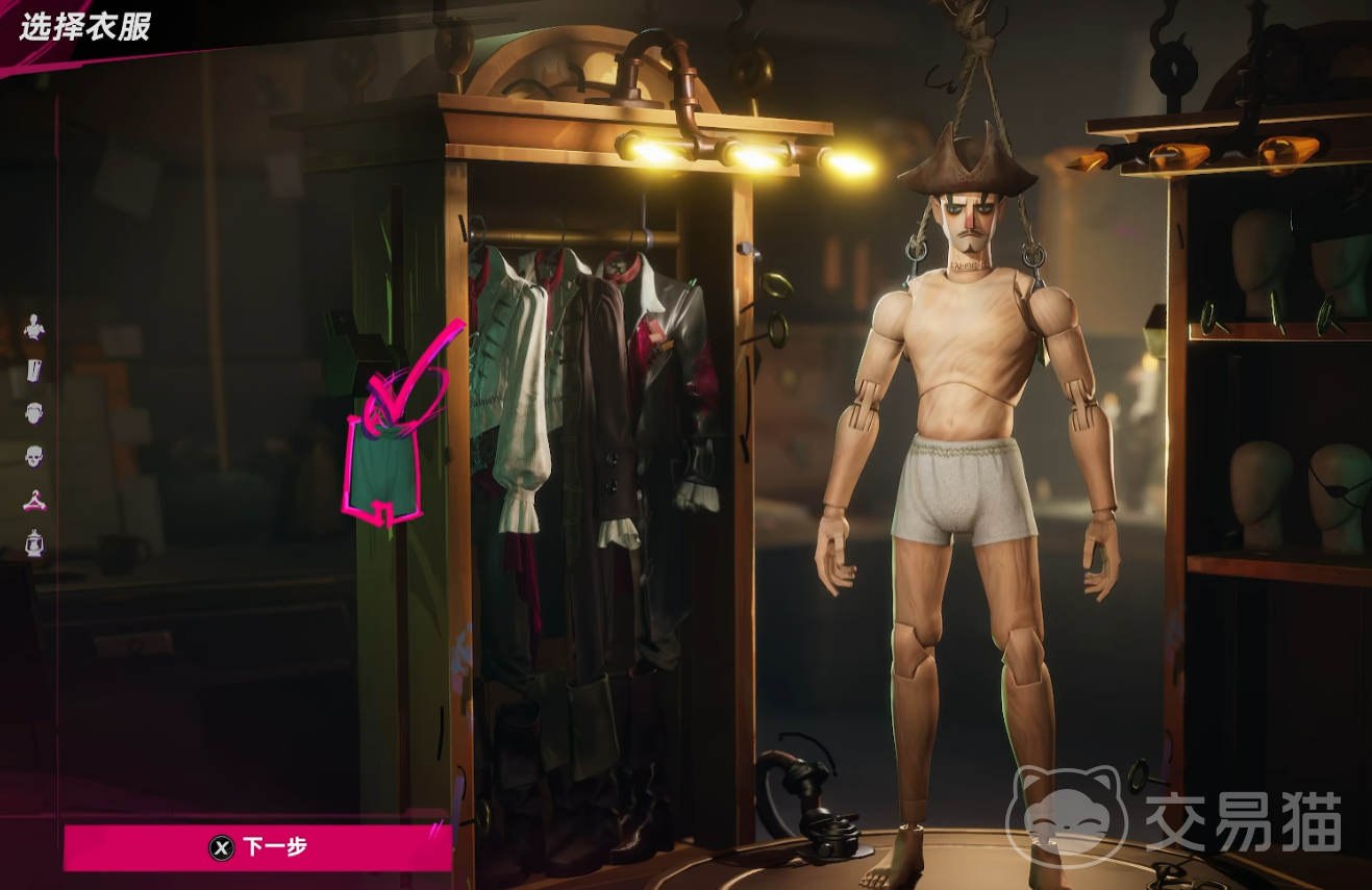 若希望零成本定制初始形象,可在角色创建阶段完成全部外观设定。完成捏脸后,系统将开放衣柜界面,支持自由搭配上装、下装、配饰等部件。例如选择复古海盗风格套装,或简约白衬衫搭配工装裤;甚至可组合出极具反差感的造型,如仅保留基础内裤并叠加木偶质感皮肤,实现高度个性化的视觉表达。