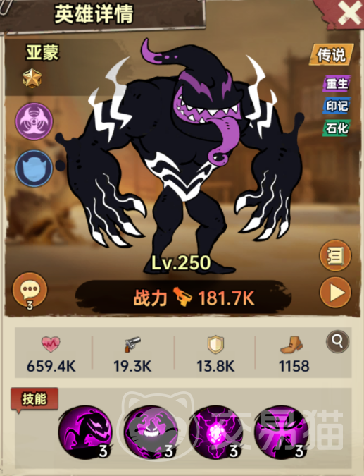 “石化触手”作为常规技能,可对单体目标施加基础伤害,并有一定概率附加一回合石化效果;若亚蒙在本回合受到攻击,则自动触发“致命寄生”,对攻击者造成附加伤害,并按一定概率恢复自身最大生命值。“不死之身”为其被动天赋:当生命值归零时,角色暂时离场;但进入下一回合时,将立即重返战场并恢复全部生命值,形成独特循环作战逻辑。