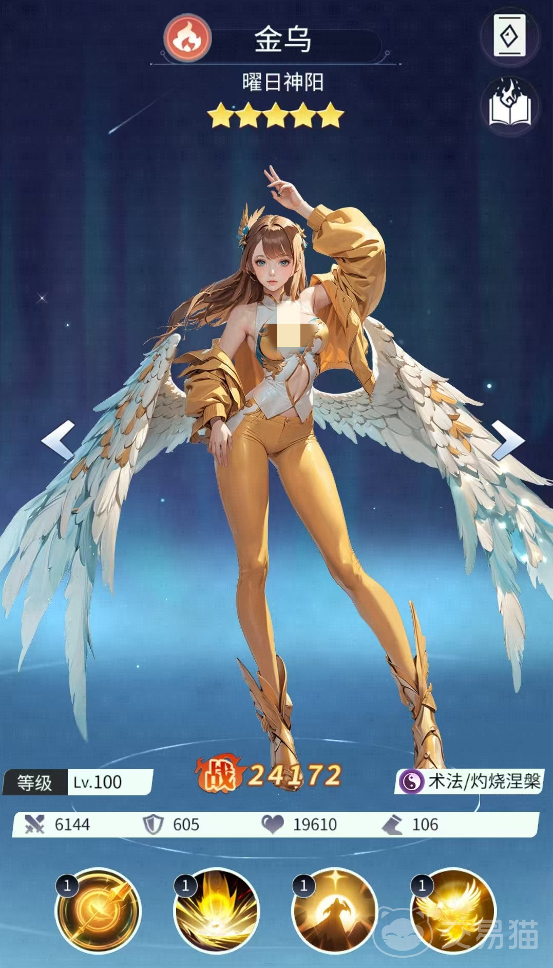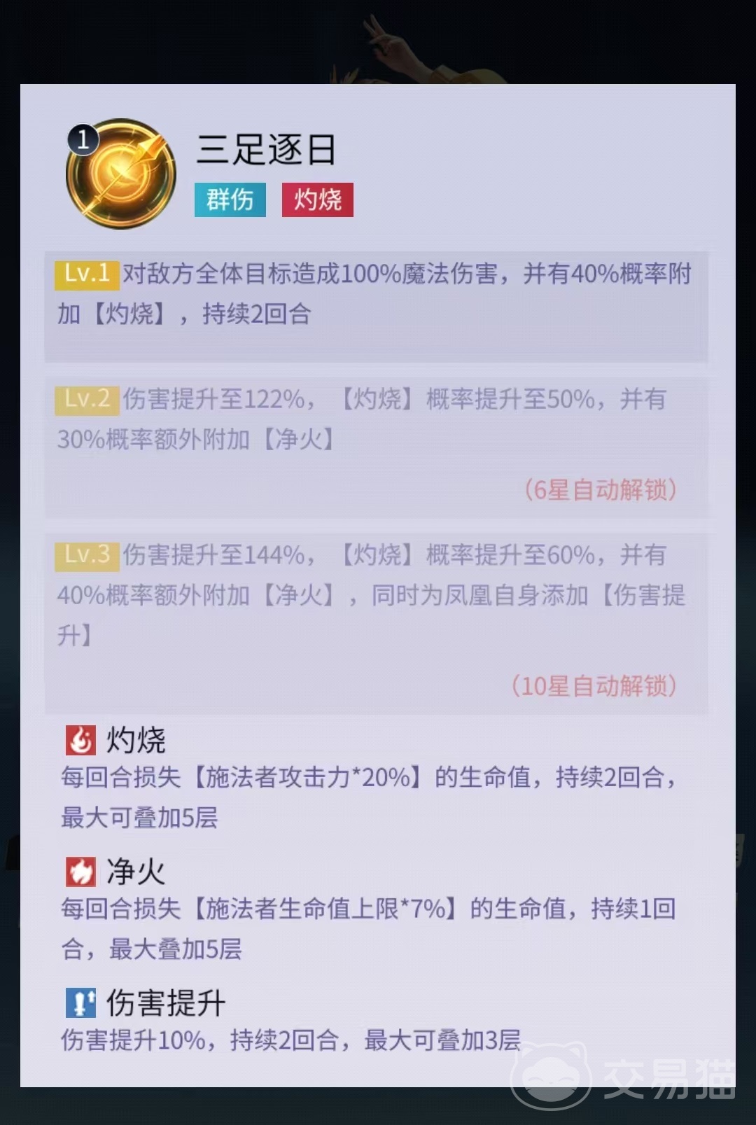 金乌的核心输出技能为怒气技,可对敌方全体单位施放魔法伤害,并有概率附加持续两回合的灼烧效果;技能升级后,灼烧触发率提升,且额外获得一定几率施加“净火”状态。需注意的是,灼烧与净火属于两种独立异常状态,二者可共存并分别结算伤害,实现持续掉血叠加,显著压缩敌方生存空间。