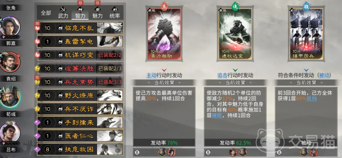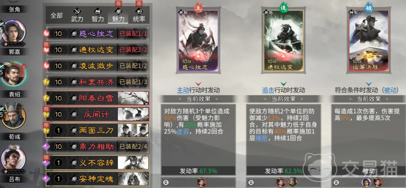 袁绍自带天赋“四世三公”具备初始群伤能力,配合荀彧“王佐之才”的属性增幅后,可进一步激活郭嘉“十胜十败”的概率增益链路,使全队技能发动效率显著提升。技能配置方面,袁绍推荐携带【惑心挫志】【通权达变】【运筹决胜】三技能:前两者强化群体压制与状态施加(如虚弱),后者则为核心被动增幅技,可多次触发其天赋效果,并附带首次受击后兵力增长机制;追击过程中还存在概率触发睡眠控制,形成兼具输出、减员与控场的复合打击链。