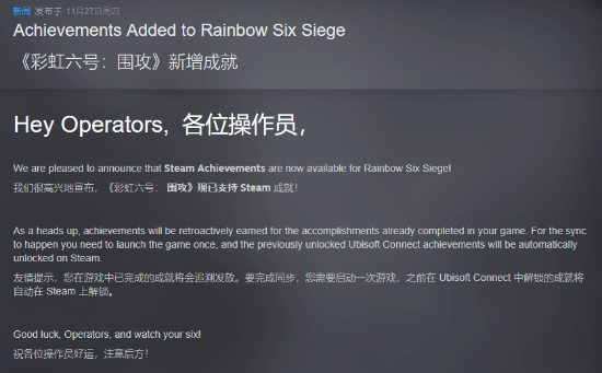 育碧在Steam新闻当中写道:“我们很高兴地宣布,《彩虹六号:围攻X》现已支持Steam成就!”