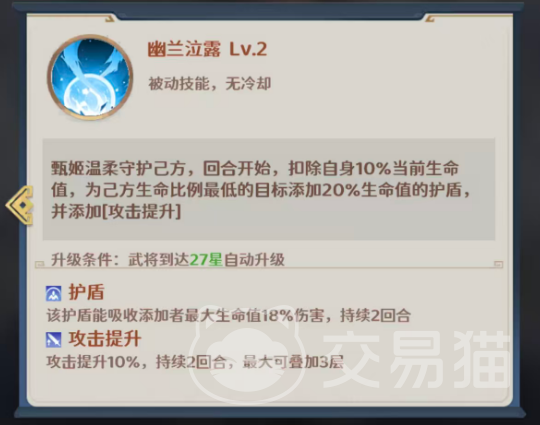 另一项被动【幽兰泣露】可在回合开始时,消耗自身当前生命值的10%,为我方生命比例最低的一名单位生成护盾。该护盾可吸收甄姬最大生命值18%的伤害,并额外提供10%攻击力加成;若叠加至三层,最高可获得30%攻击提升。此机制特别适合在决胜阶段保护核心输出,实现反杀或收割,但需注意甄姬自身血量安全阈值,确保扣血后仍具备基本作战能力。