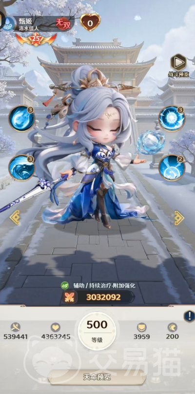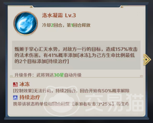 甄姬拥有专属称号“洛水佳人”,其主动技能【洛水凝霜】可对敌方单列目标造成157%法术伤害,并有41%概率附加冰冻效果。该控制状态可使目标当回合无法行动;且每回合初始时,存在50%概率自动解除。值得注意的是,只要冰冻成功命中,即可为我方生命比例最低的两名队友施加持续治疗——每回合恢复量等于甄姬攻击力的25%,因此其攻击属性越高,团队续航能力越强。