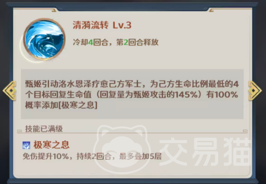 大招【清漪流转】为范围疗愈技能,可为目标生命值最低的四名友军恢复相当于甄姬攻击力145%的生命值,并100%赋予“极寒之息”状态。该状态提供10%免伤效果,最多可叠加至5层,有效提升团队整体承伤能力。该技能兼具高覆盖率与高回复效率,是阵容中期至后期关键续航保障。