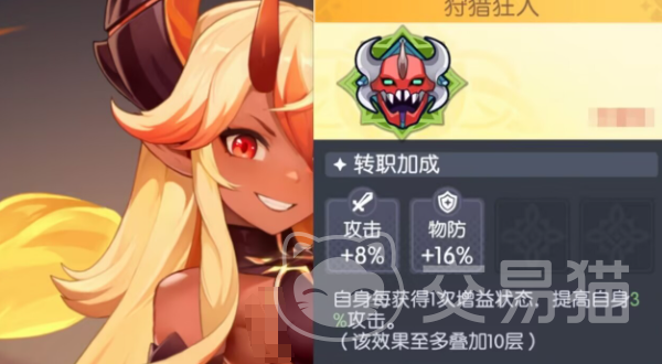狩猎狂人:提供16%攻击力与8%物理防御,其核心机制为增益联动——每次获得任意增益状态,即可叠加3%攻击力,最高可叠至10层,达成30%总攻击力提升。该转职对角色获取增益的效率要求极高,若角色缺乏快速叠层手段或增益覆盖率不足,则实际收益将大幅缩水,需结合具体技能循环与队伍辅助配置审慎评估。